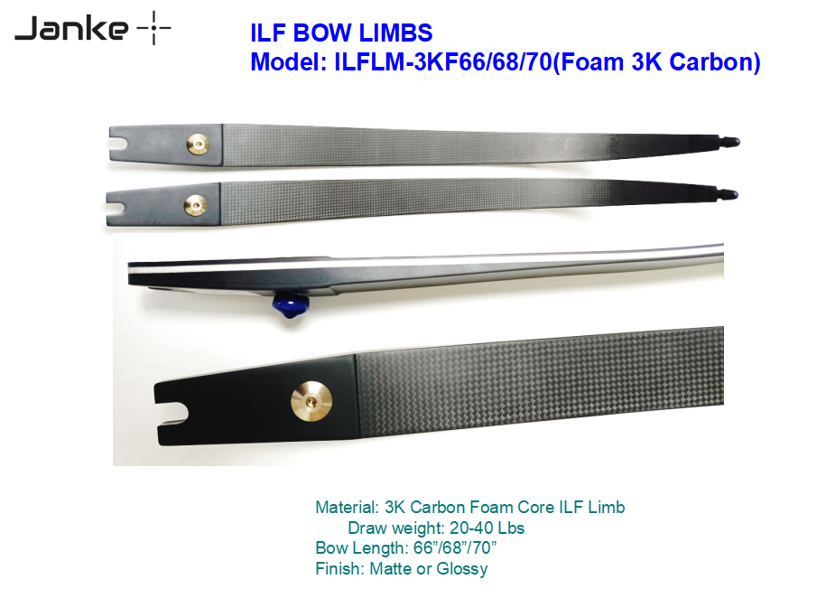 Material: 3K Carbon Foam Core ILF Limb Draw weight: 20-40 LbsBow Length: 66”/68”/70”Finish: Matte or Glossy